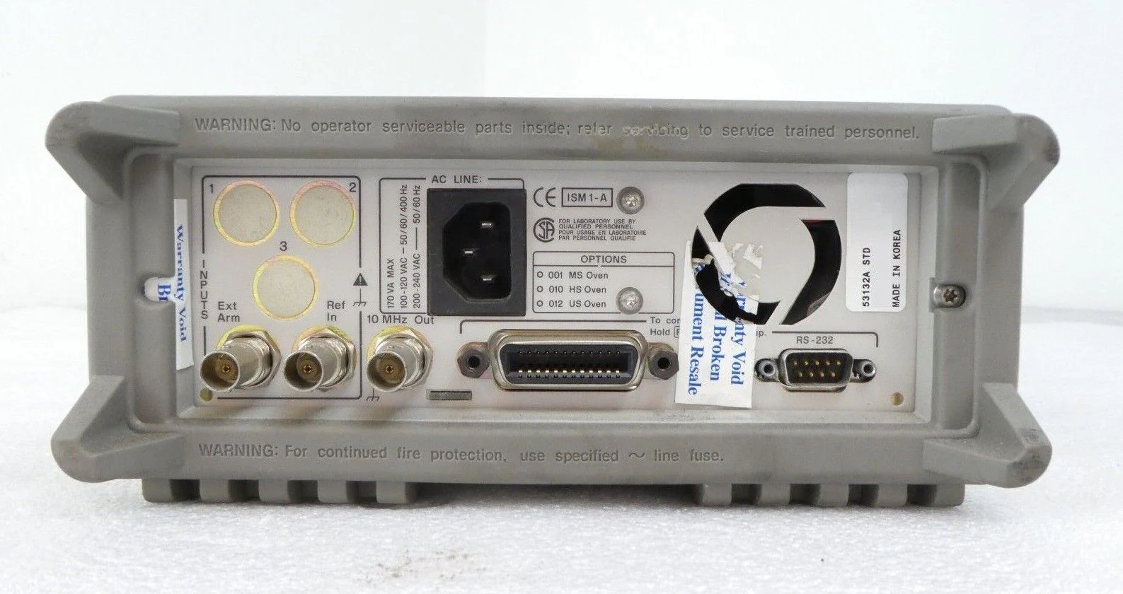 This HP Hewlett-Packard 53132A Universal Frequency Counter is used working surplus. The physical condition is good, but there are signs of previous use and handling.